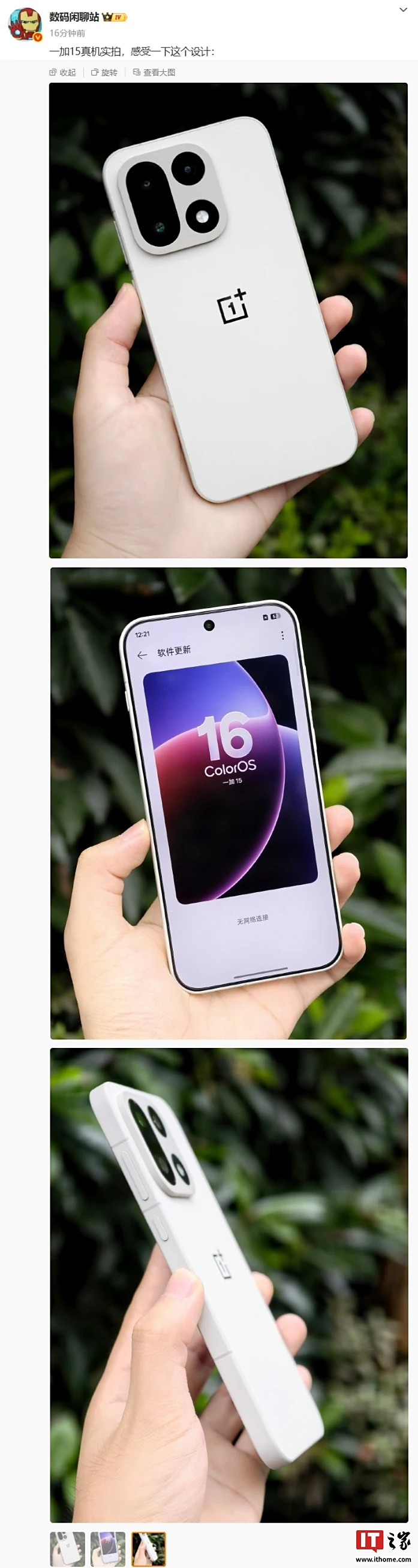 IT之家 9 月 28 日消息,博主 @数码闲聊站 今日分享了一加 15 真机实拍图。从图片来看,一加 15 采用四等边大 R 角直屏 + 直角边框设计,背面左上角为矩阵 Deco,设计风格延续一加 13T,不再和哈苏联名(一加创始人刘作虎 Pete 此前在海外一加社区宣布一加与哈苏在影像方面的合作已告结束)。