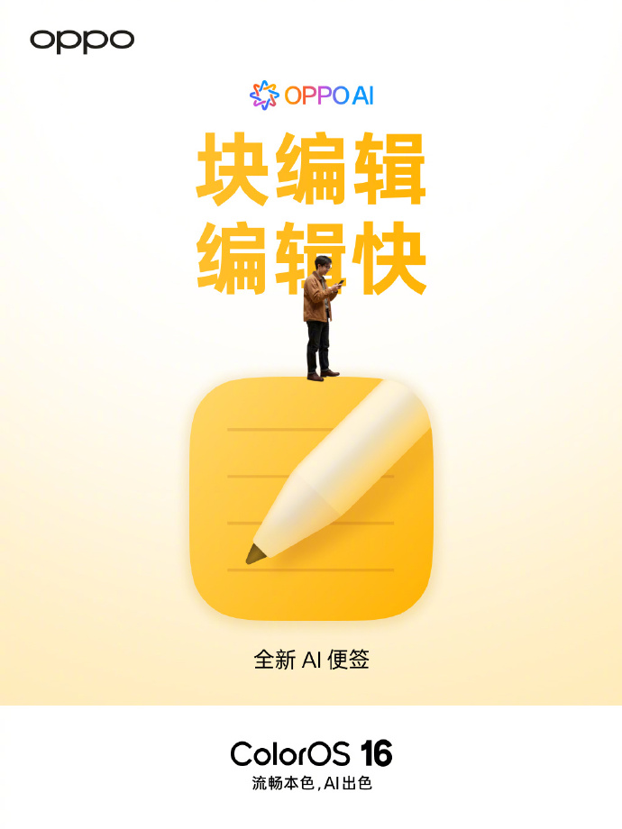 他还透露,ColorOS 16 上的便签应用也有大量变化,从阅读美学的排版布局调整,再到高效的编辑体验全面升级。全新的「块编辑」,所有段落、文字、图片、文件、表格全体模块化,让选择对象和批量编辑的效率得到了巨大提升。ColorOS 16 做了非常多针对手写笔的 AI 书写功能,从字迹实时美化,到手写计算器,到手写体 AI 搜索。
