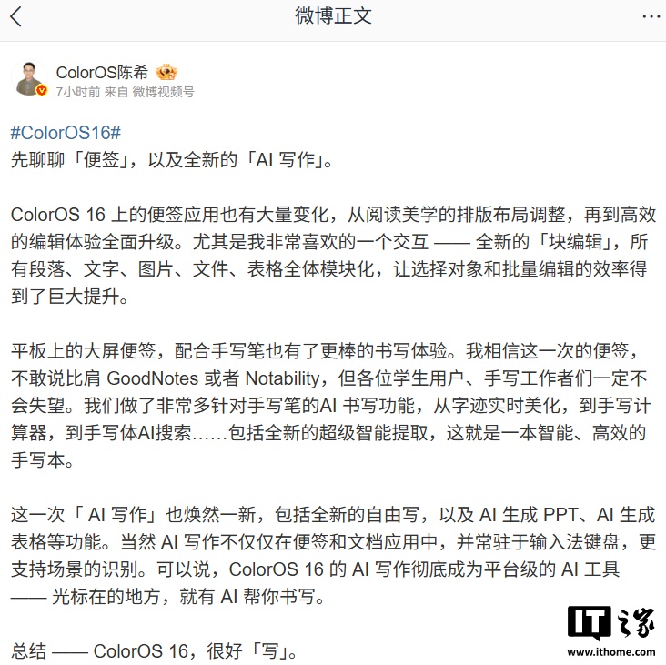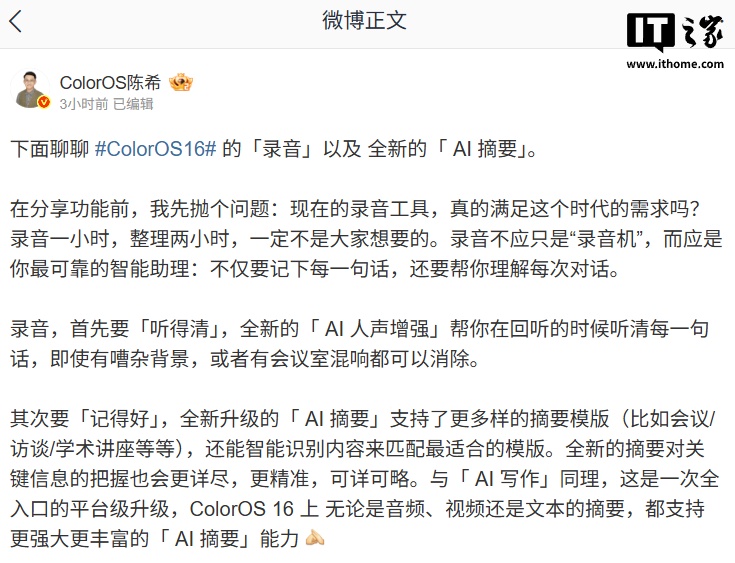 IT之家 9 月 28 日消息,OPPO ColorOS 16 将于 10 月 15 日发布,ColorOS 设计总监陈希今日对其录音、AI 摘要、便签、AI 写作等功能进行了介绍。