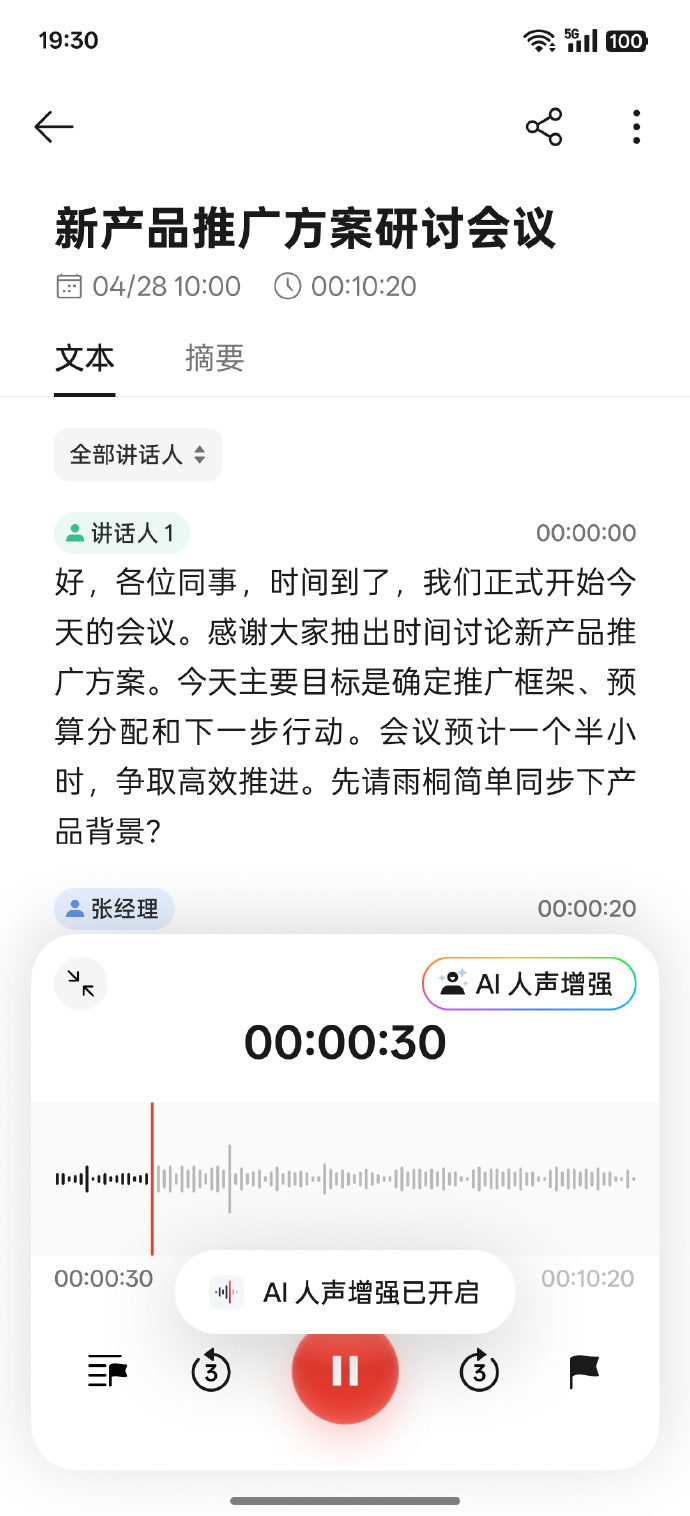 陈希称,录音首先要“听得清”,全新的“AI 人声增强”帮你在回听的时候听清每一句话,即使有嘈杂背景,或者有会议室混响都可以消除。