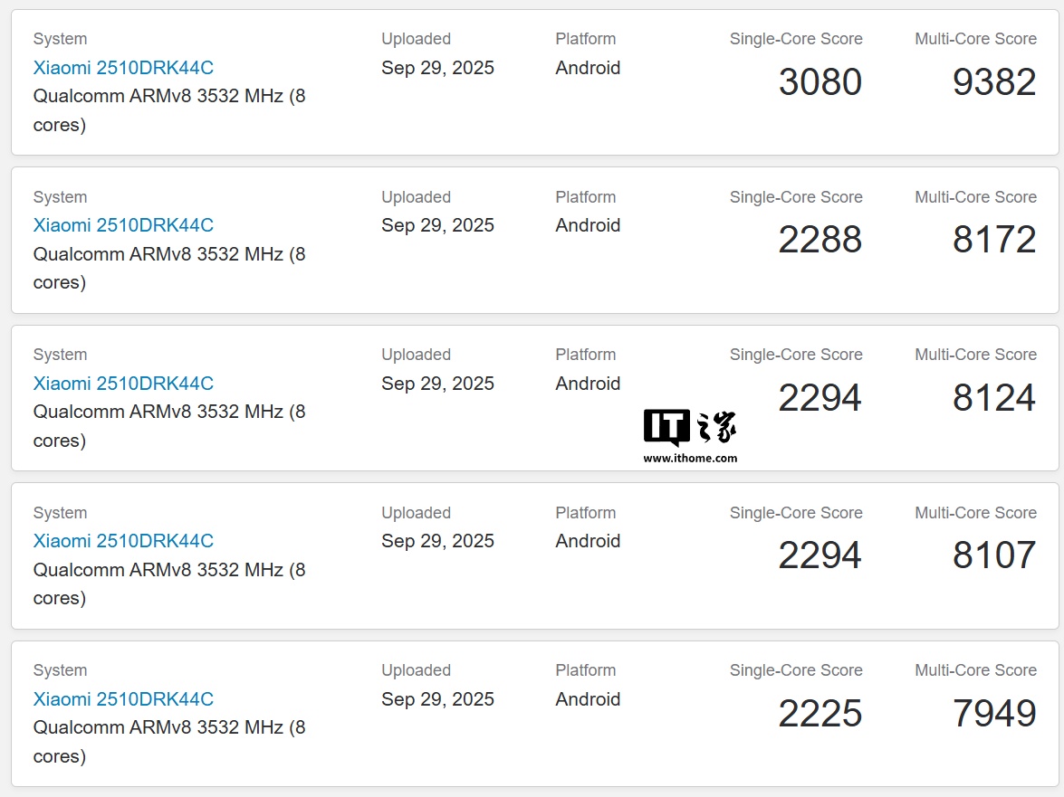 IT之家 9 月 30 日消息,科技媒体 Notebook Check 昨日(9 月 29 日)发布博文,报道称小米 REDMI K90 手机现身 GeekBench 跑分库,型号为“2510DRK44C”,共有 5 条纪录,最高跑分为单核 3080 分,多核 9382 分。