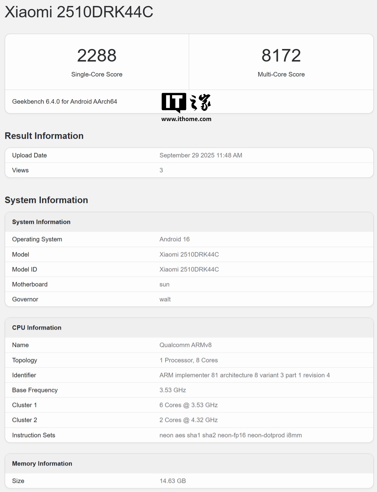 此前消息称该机会配备高通骁龙 8 Gen 5 芯片,最新跑分信息来看,小米 REDMI K90 将采用高通骁龙 8 至尊版芯片,并搭配 Adreno 830 GPU。页面信息还显示该机配备 16GB 内存。