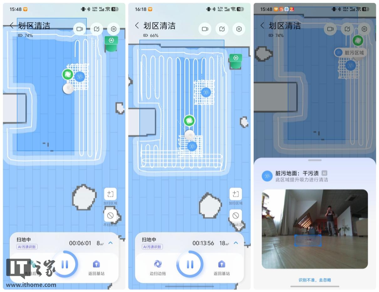 更智能的是,它还能通过摄像头识别地面的干湿垃圾,并实时切换清洁策略,例如在检测到一滩干污渍时,会自动开启深度清洁模式(如上图“#字清洁区域”)。