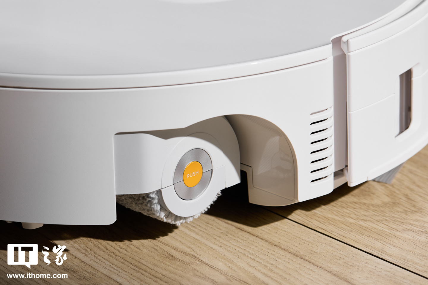 底部是石头 P20 活水版最明显的设计改动:搭载了类似于洗地机的滚刷拖布设计,而非传统拖布形态。值得一提的是,这一滚刷并非固定结构:它支持上下升降,还具备向右伸缩的功能,能进一步扩大清洁覆盖范围,减少家具底部、墙角等区域的卫生死角。