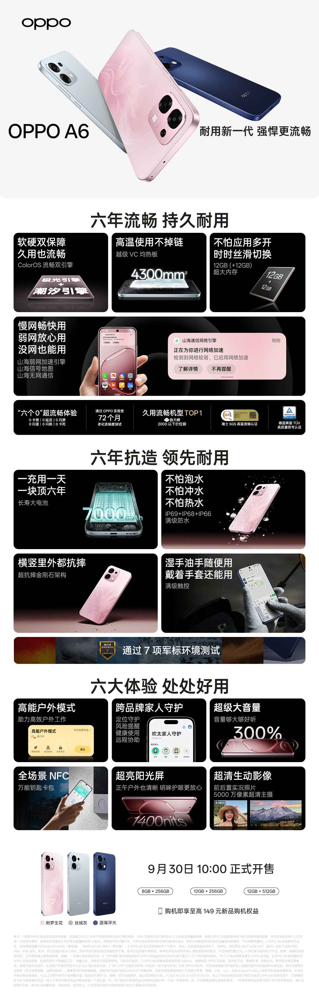 OPPO A6 提供三种存储配置:8GB + 256GB、12GB + 256GB 和 12GB + 512GB。用户在购买时还可享受至高 149 元的新品购机权益。