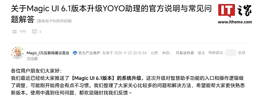 IT之家 9 月 30 日消息,荣耀官方产品维护 @Magic_OS互联网建议雷达 在荣耀俱乐部发布了“关于 Magic UI 6.1 版本升级 YOYO 助理的官方说明与常见问题解答”,称最近给荣耀 X20 等老机型推送了系统更新,并表示老机型升级后,原预装的华为智慧语音将升级为荣耀 YOYO 助理。