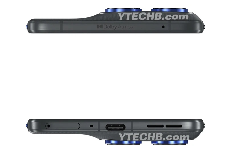 机身布局方面,电源键和音量键位于机身右侧,左侧为新增的 Moto AI 专用键。机身底部集中了 SIM 卡槽、USB Type-C 接口和扬声器开孔。值得注意的是,机身顶部印有杜比全景声(Dolby Atmos)的品牌标识,预示着该机将具备出色的音频体验。