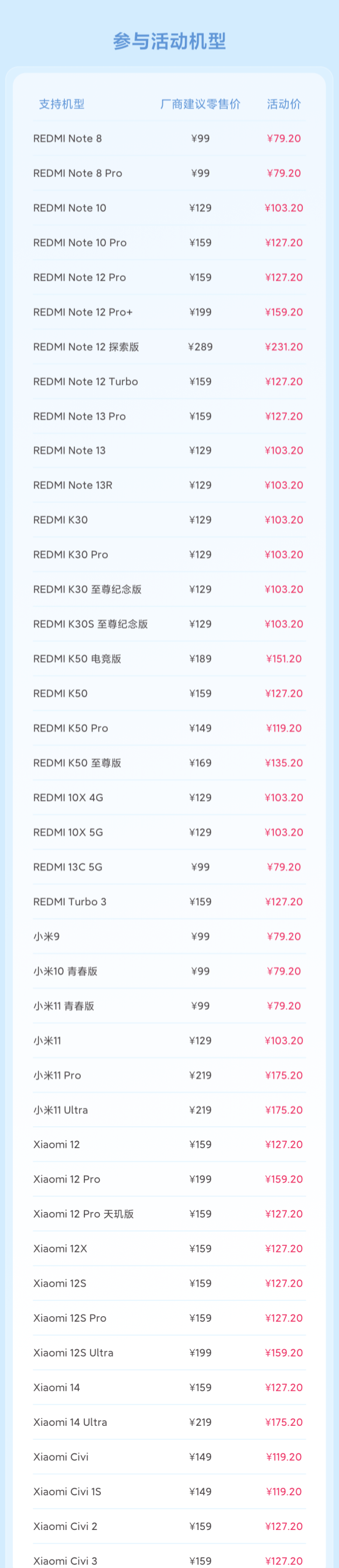 IT之家 10 月 1 日消息,小米十月服务周活动今日上线,手机电池换新 79.2 元起,小米、REDMI 品牌笔记本 5 折深度清洁,家电清洁一口价 99 元,活动时间为 10 月 1 日 10:00-10 月 7 日 24:00。具体支持机型如下: