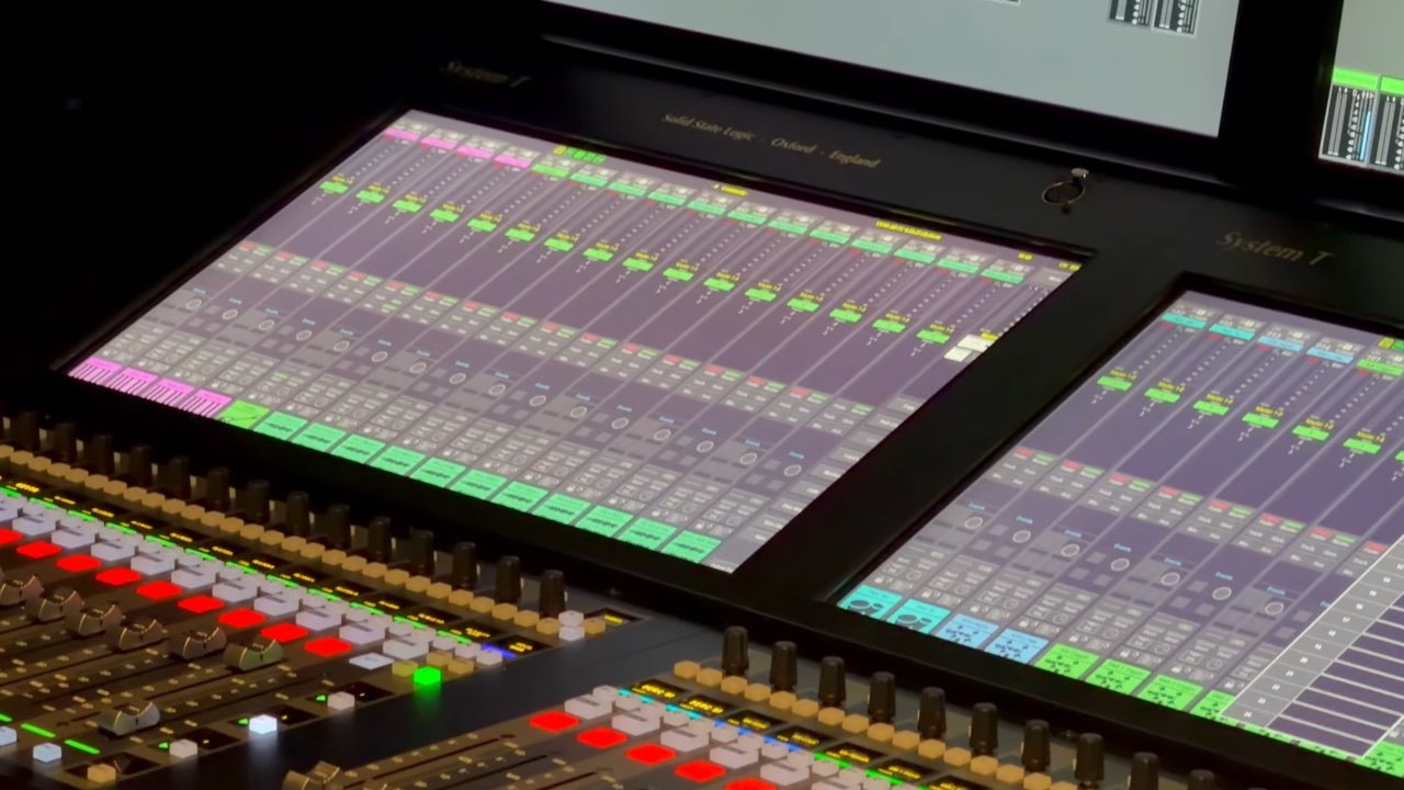最令人惊叹的还是空间音频混音室,里面配有 9.2.4 PMC 扬声器系统,可让人仿佛置身在音乐之中,整套系统由两台苹果芯片的 Mac Pro 台式电脑驱动,同时可以看到混音台采用了“混合设计”,上半部分是屏幕显示出的虚拟音频条,下半部分则是真实的推子。