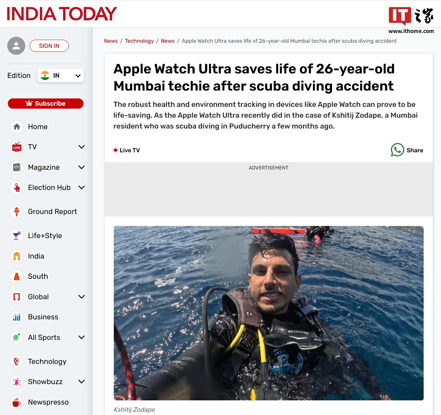 IT之家 10 月 3 日消息,据《今日印度》昨天报道,苹果 Apple Watch Ultra 的上浮警报功能成功拯救了一名潜水员,使这名潜水员从致命危险中逃生。