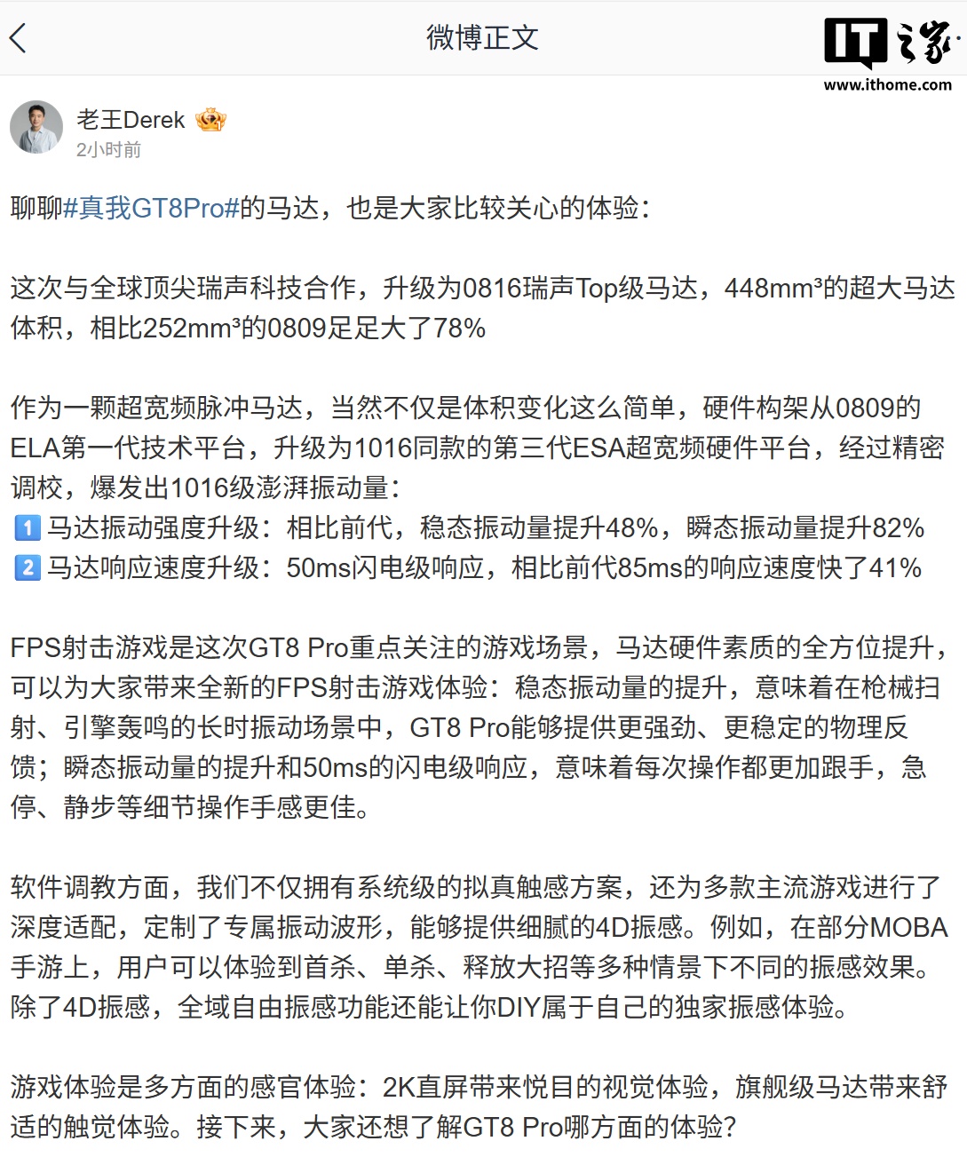 IT之家 10 月 3 日消息,realme 真我副总裁王伟今天在微博透露了 GT8 Pro 的震动方案,将用“软硬结合”使手机的震感体验更好。