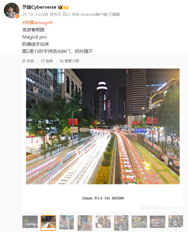 IT之家 10 月 4 日消息,荣耀首席影像工程师罗巍昨晚在微博分享了 Magic8 Pro 手机的拍摄样张,其中包括“15 秒手持流光快门”的样张,并询问网友“防抖强不”。