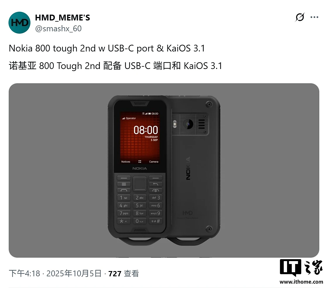 IT之家 10 月 6 日消息,消息源 @smashx_60 昨日(10 月 5 日)在 X 平台发布推文,曝料称 HMD Global 计划更新诺基亚 800 Tough 三防功能机,在保留原版设计前提下,端口升级到 USB-C 接口,系统升级到 KaiOS 3.1 版本。