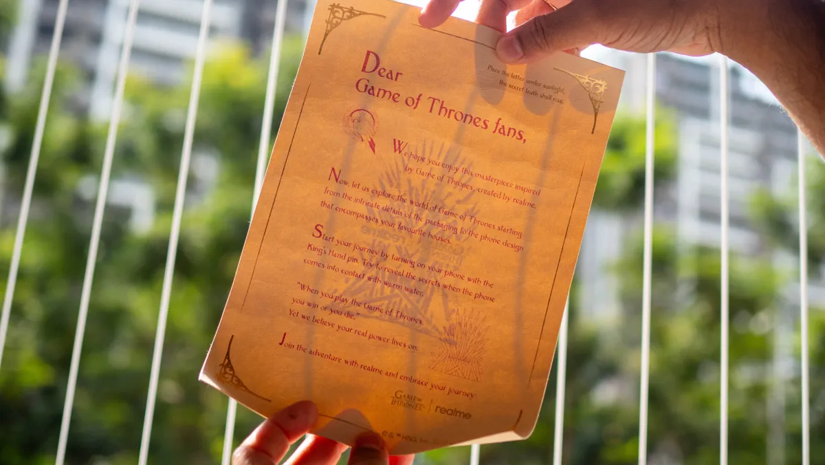 开箱后我们还可以看到一封采用紫外线处理的信件,用户需要将信拿到太阳底下才能看到内容,拿下第一层后可以看到国王之手造型的 SIM 取卡针、印有剧集人物的明信片 / 贴纸、保护壳、80W 快充充电器和充电线。