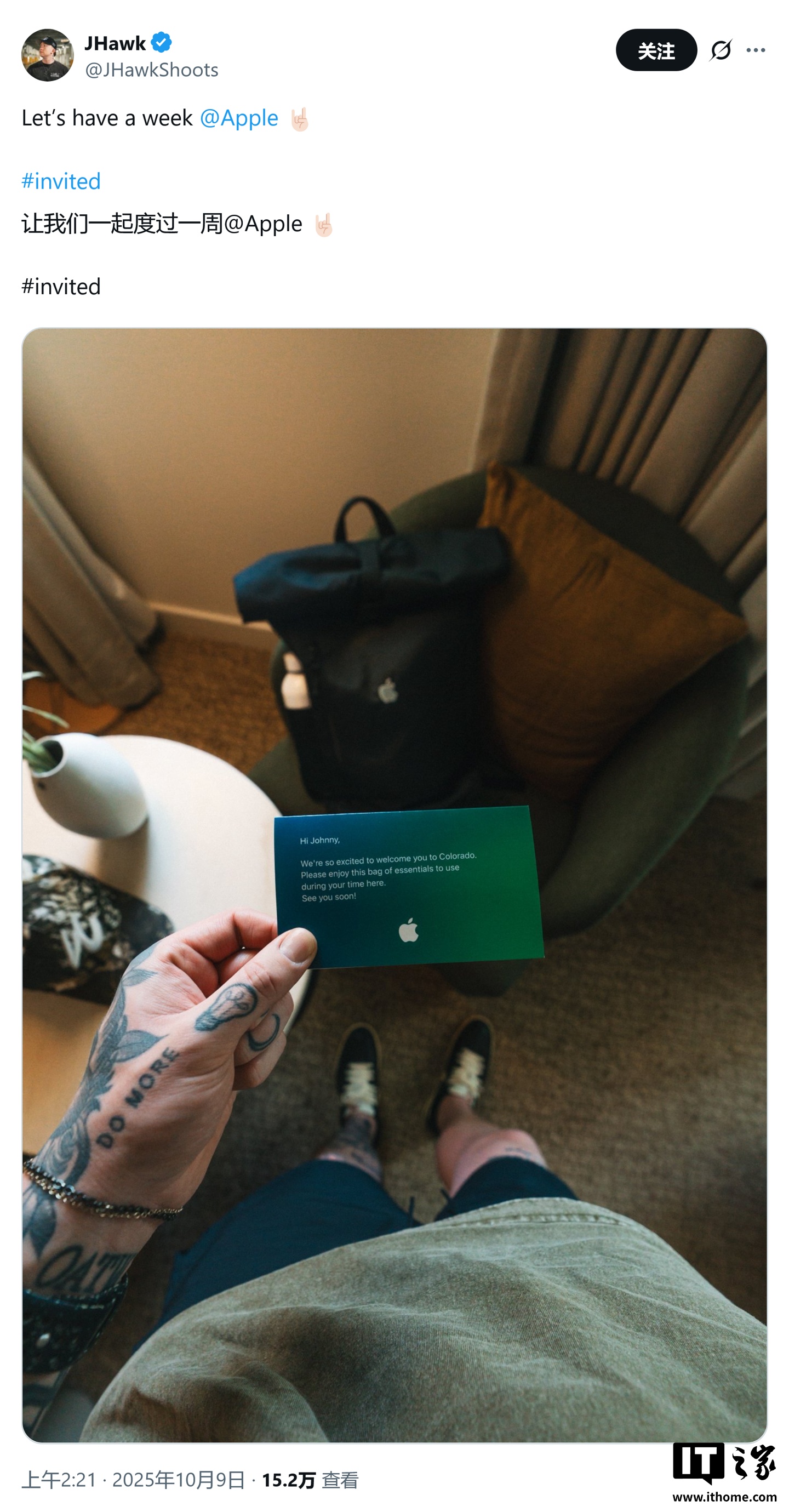 IT之家 10 月 9 日消息,科技媒体 Appleinsider 今天(10 月 9 日)发布博文,报道称苹果邀请 @JHawkShoots 等多位网红科技博主,前往科罗拉多州参加一项未知活动,行程为期 11 天。