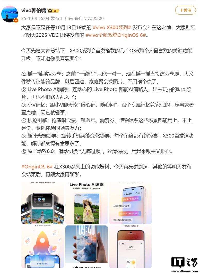 IT之家 10 月 9 日消息,vivo 产品经理韩伯啸今天汇总了全新 OriginOS 6 系统的升级要点,主打原子动效 6.0“无感过渡”滑动切换及动态照片 Live Photo AI 消除等,增加了多种实用功能。