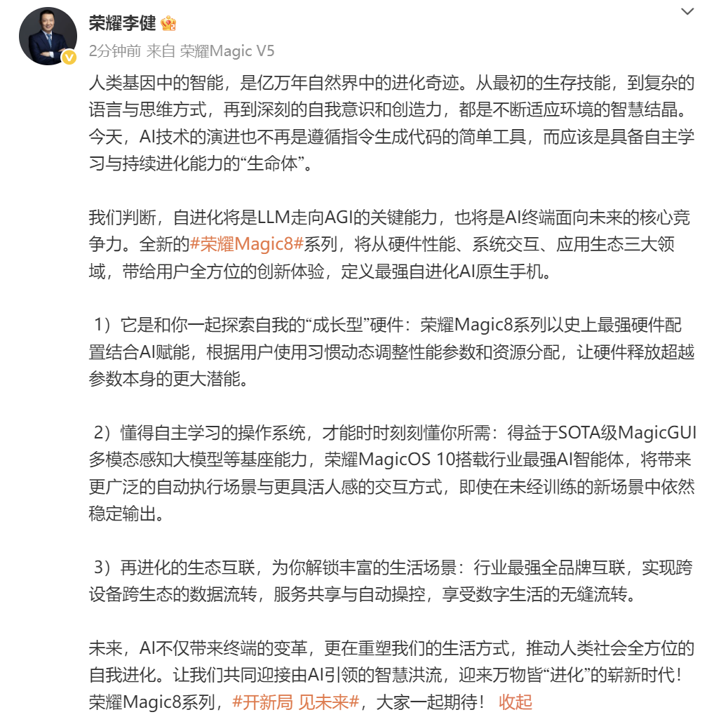 说到 AI,早在 9 月 8 日,荣耀 CEO 李健微博预热 Magic 8 系列时就表示,全新的#荣耀 Magic8#系列,将从硬件性能、系统交互、应用生态三大领域,带给用户全方位的创新体验,定义最强自进化 AI 原生手机。
