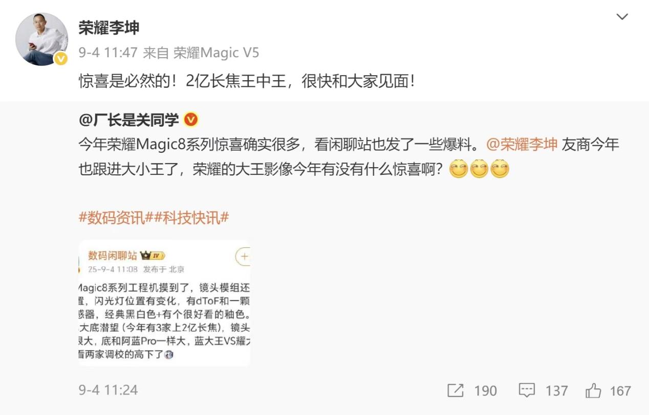 此外荣耀旗舰手机产品经理李坤此前也在讨论 Magic8 系列的微博中回复网友称“惊喜是必然的!2 亿长焦王中王,很快和大家见面!”