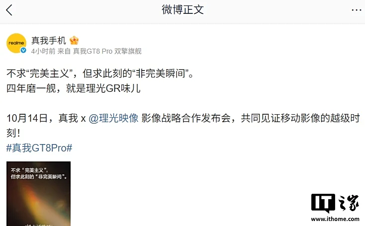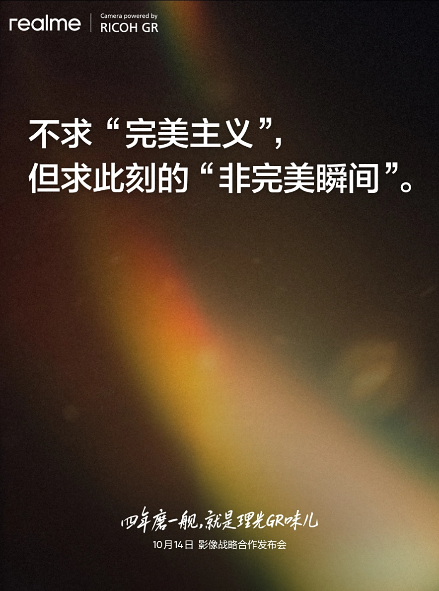 IT之家 10 月 9 日消息,realme 今日宣布,真我 x 理光影像战略合作发布会将于 10 月 14 日举行,共同见证移动影像的越级时刻。