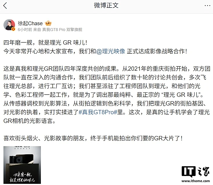 IT之家注意到,真我 realme 副总裁、全球营销总裁、中国区总裁 @徐起Chase 今天上午已经宣布,真我与理光映像正式达成影像战略合作。