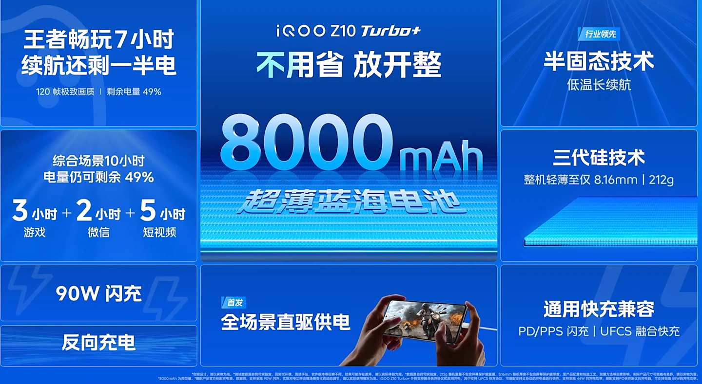 iQOO Z10 Turbo+ 搭载 8000mAh 超薄蓝海电池。真实使用场景下,游戏 + 微信 + 短视频 10 小时畅玩,仍剩余 49% 的电量。机身重量为 212g、厚度为 8.16mm,支持 90W 闪充、反向充电、直驱供电技术,支持 55W PD、44W 第三方 UFCS。