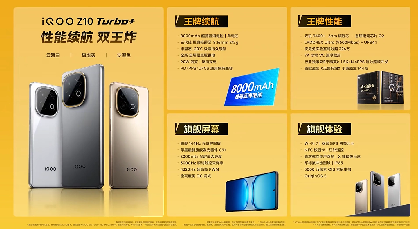 iQOO Z10 Turbo+ 手机发布于 8 月 7 日,搭载 8000mAh 电池、天玑 9400+ 处理器,12GB+256GB 版发售价为 2199 元。