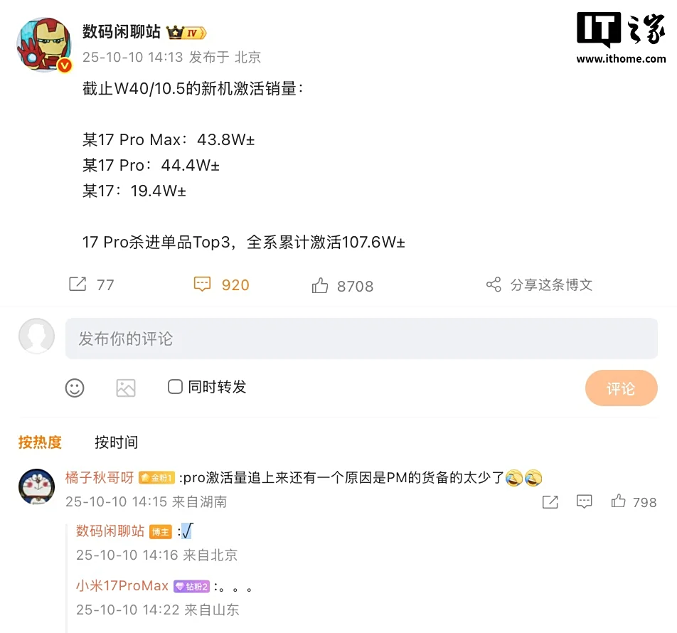 IT之家 10 月 11 日消息,博主 @数码闲聊站 发文,透露截至“W40/10.5”新机激活销量榜中,“某 17 Pro Max”达 43.8W±、“某 17 Pro”达 44.4W±、“某 17”达 19.4W±,并表示 17 Pro 杀进单品 Top3,全系累计激活 107.6W±。综合评论区,预计相应机型为小米 17 系列手机