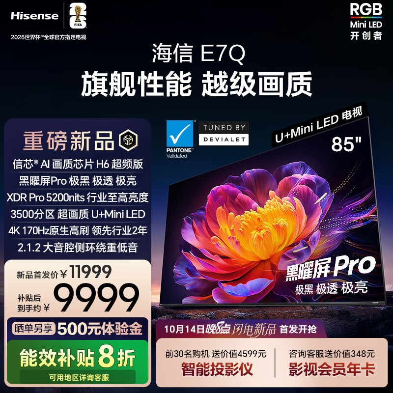 京东海信电视 E7Q 85 英寸 信芯芯片 H6 超频版 黑曜屏 Pro XDR5200nits 3500 分区 300Hz 国家补贴 e7npro 升级国补后 9999 元起直达链接