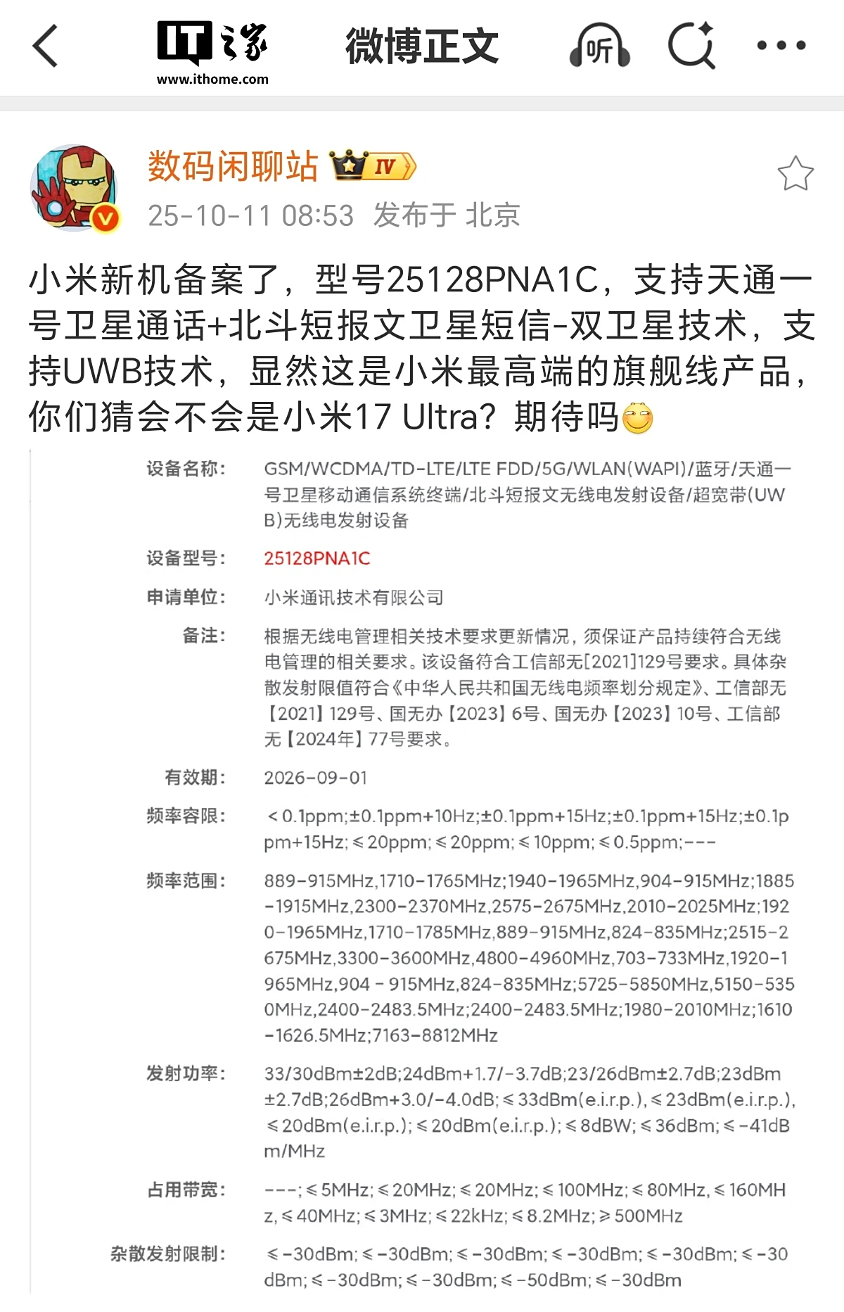 IT之家 10 月 11 日消息,一款型号为 25128PNA1C 的小米新机昨日通过工信部无线电核准,支持天通一号卫星通话、北斗短报文卫星短信、UWB 技术等。