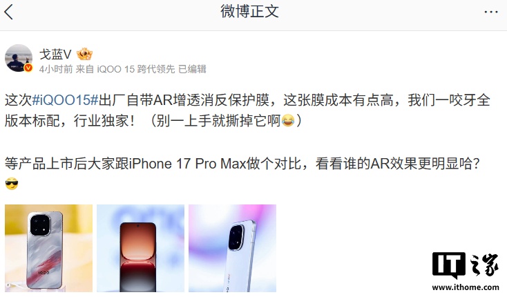 IT之家 10 月 11 日消息,iQOO 产品经理 @戈蓝V 今日发文透露,iQOO 15 出厂自带 AR 增透消反保护膜,全版本标配、行业独家,并称“这张膜成本有点高”。
