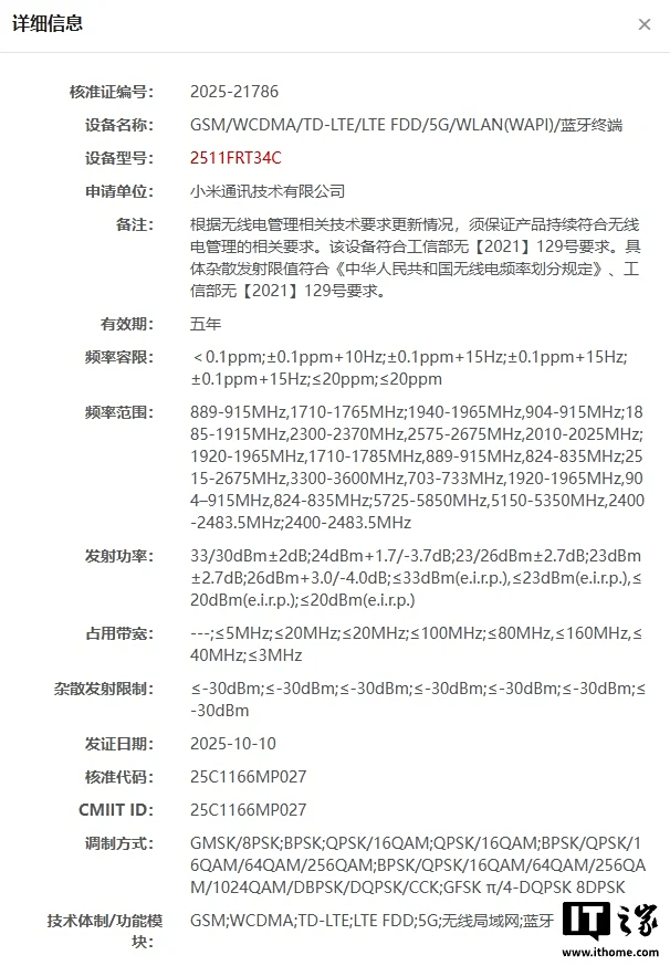 IT之家 10 月 12 日消息,一款型号为 2511FRT34C 的小米新机于 10 月 10 日通过了工信部无线电核准,预计为 REDMI Turbo 5。