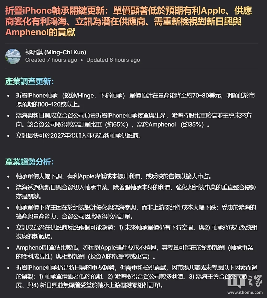 富士康与新日兴已成立合资企业,承担大部分铰链单元的生产任务。据郭明錤估计,两家合计市场份额约为 65%,剩余约 35% 由安费诺(Amphenol)供应。郭明錤还指出,立讯精密(Luxshare)最快可在 2027 年加入并成为新铰链供应商。