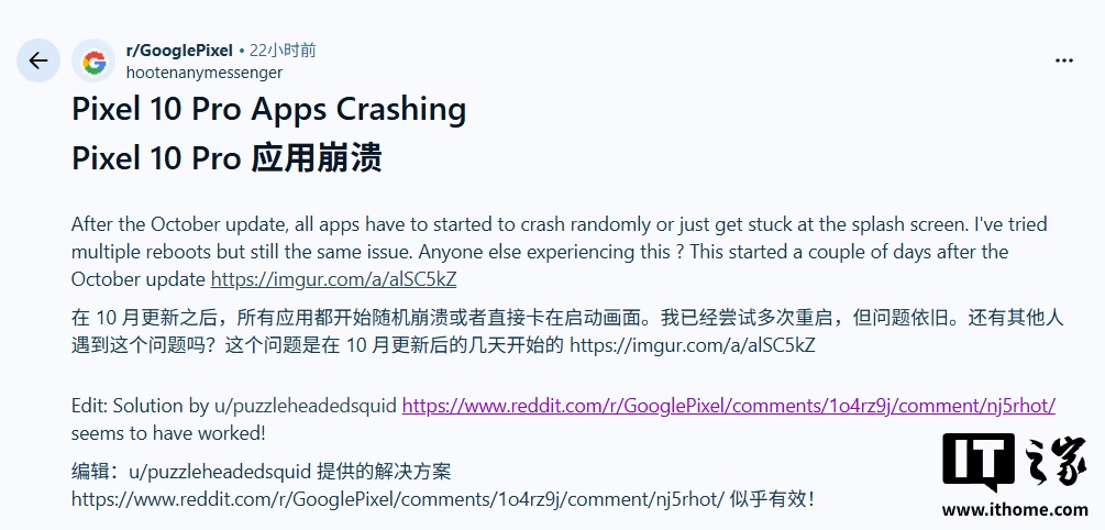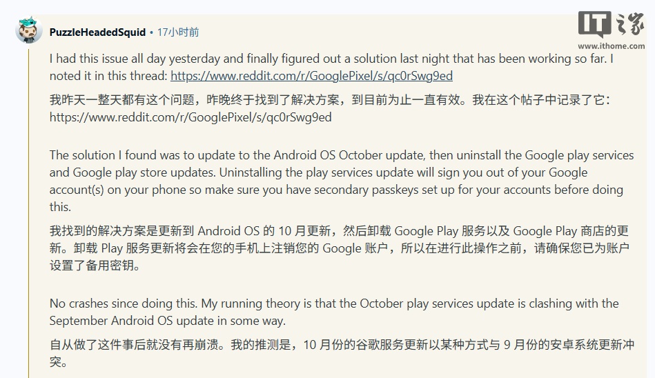 文章来源于互联网:曝谷歌 Pixel 10 系列手机现 App 频繁崩溃问题,重装 Play 服务 / 商店、更新十月补丁可部分解决