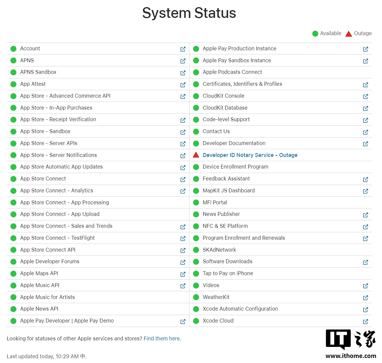 苹果开发者系统状态页面显示,Developer ID Notary Service 处于中断状态。