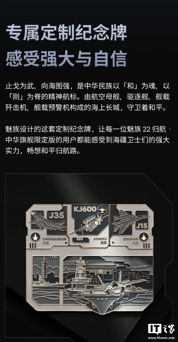 手机的礼盒内还含有专属定制手机壳,用金属油墨工艺的金色线条勾勒出我国首艘电磁弹射的 18 号航母、万吨大驱、隐形舰载机等先进装备,还带有专属定制纪念牌,让购买该机的用户感受到海疆卫士们的强大实力,畅想和平归航路。