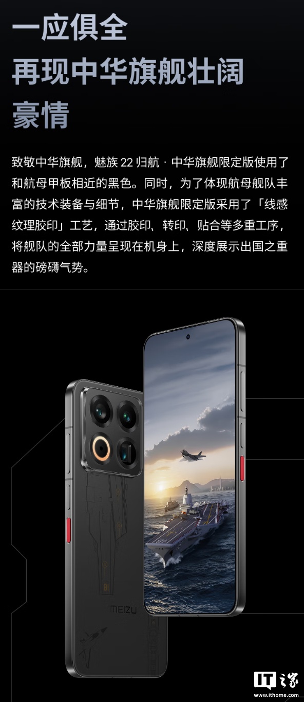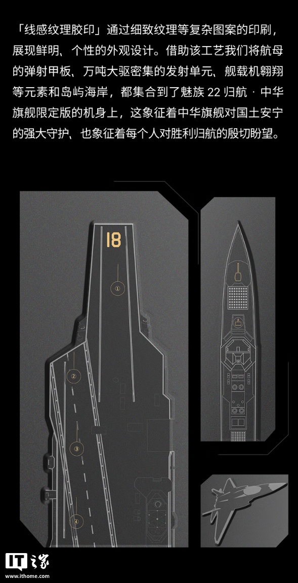 据官方介绍,这款手机致敬中华旗舰,使用和航母甲板相近的黑色,采用“线感纹理胶印”工艺,通过胶印、转印、贴合等工艺,将航母弹射甲板、万吨大驱密集的发射单元、舰载机翱翔等元素呈现在机身上,展示“国之重器”的气势。
