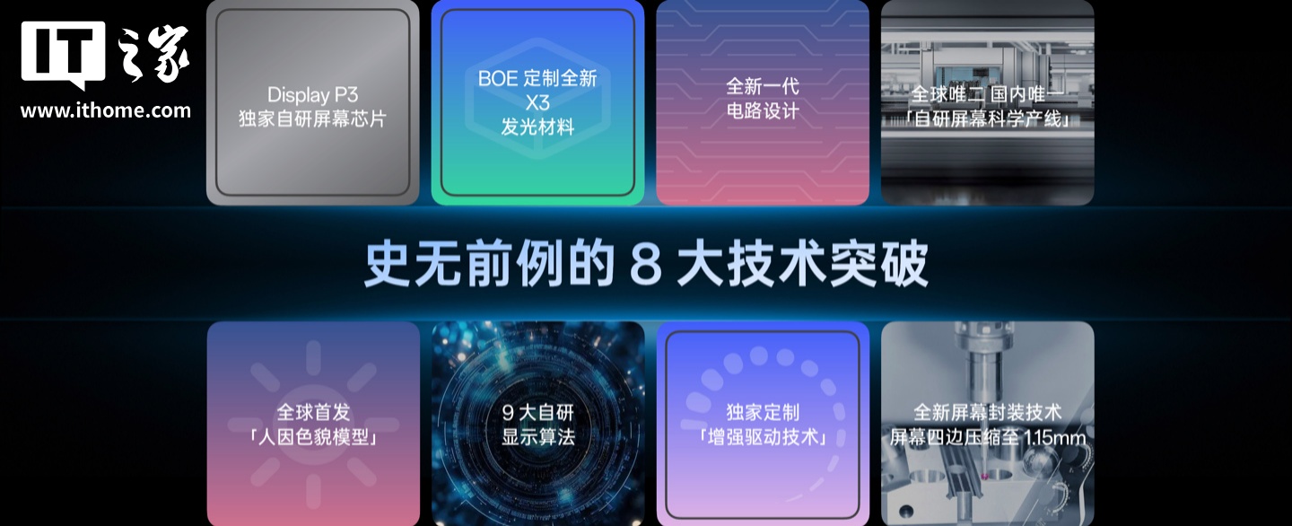 IT之家从发布会获悉,该屏幕宣称实现 8 大技术突破,刷新 9 大世界纪录,配备 Display P3 独家自研屏幕芯片、全新 X3 发光材料等,屏幕四边压缩至 1.15mm。