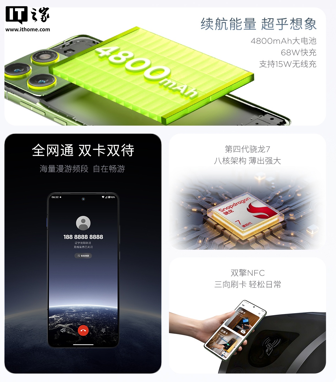 硬件方面,这款手机配备 4800mAh 大电池,搭配 68W 有线快充 + 15W 无线充电,搭载第四代高通骁龙 7 处理器,采用八核架构,机身内置双擎 NFC,支持三向刷卡,还配有全网通双卡双待,号称支持“海量漫游频段”。