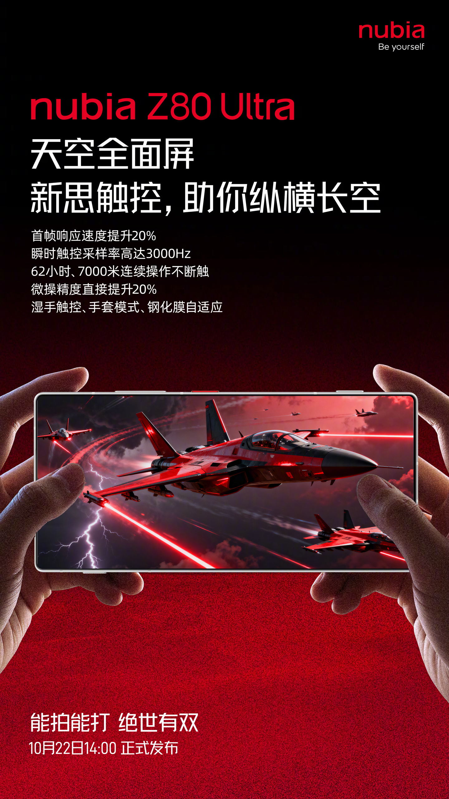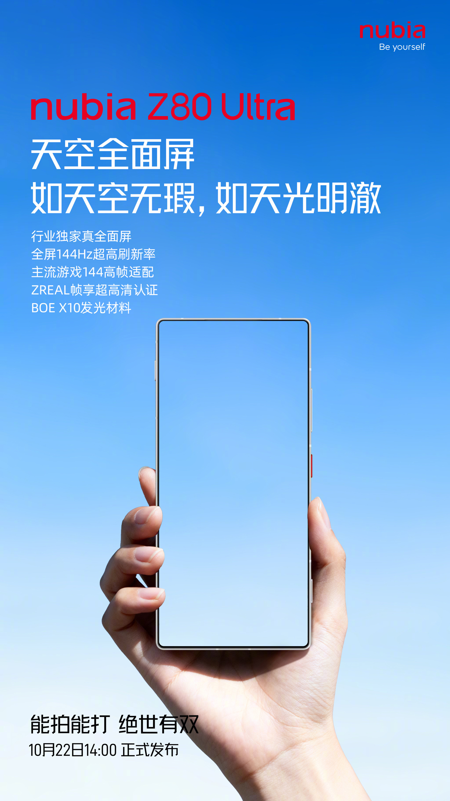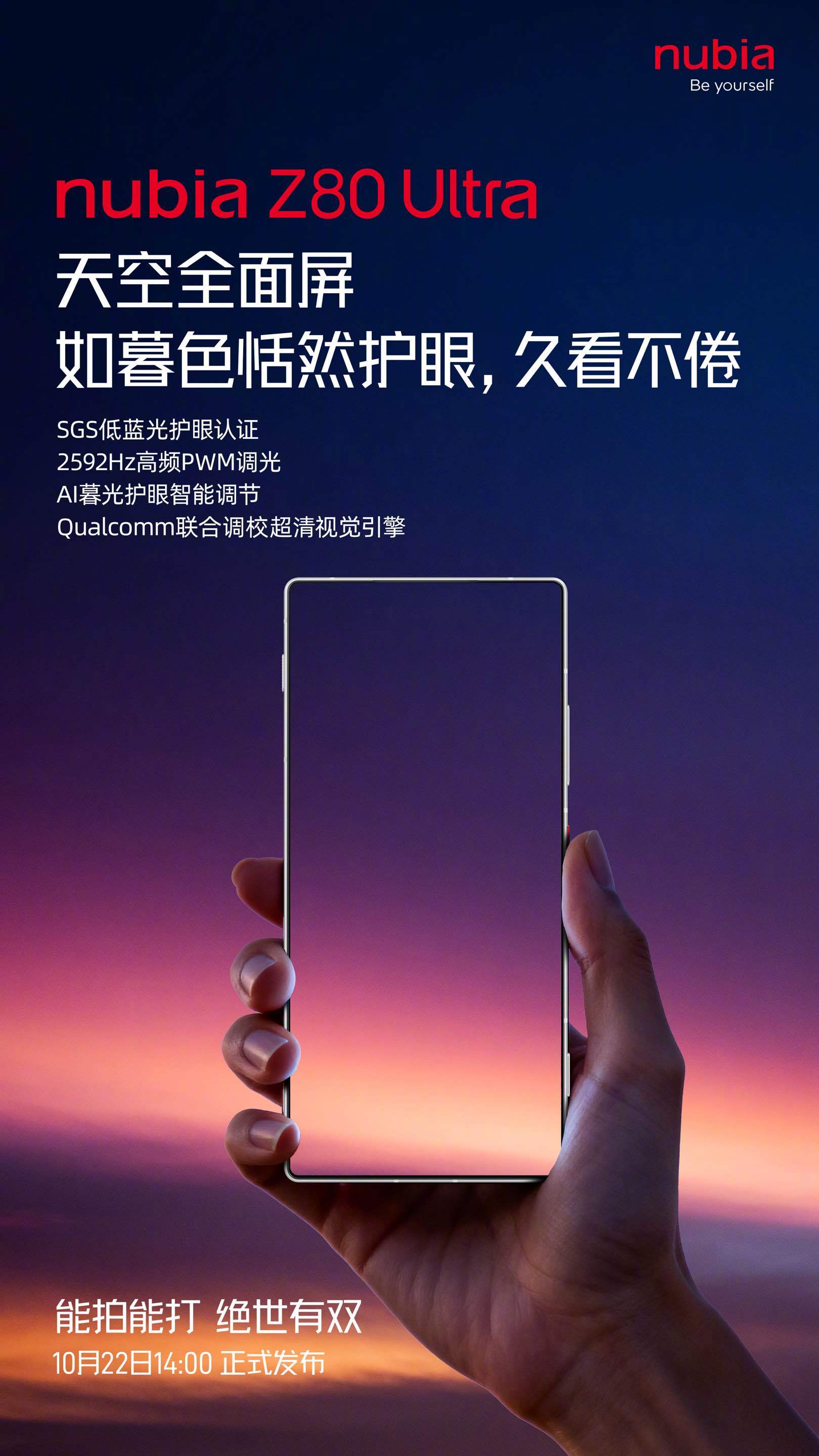 努比亚 Z80 Ultra 将于 10 月 22 日 14 时正式发布。这款手机的 Slogan 为“能拍能打,绝世有双”。