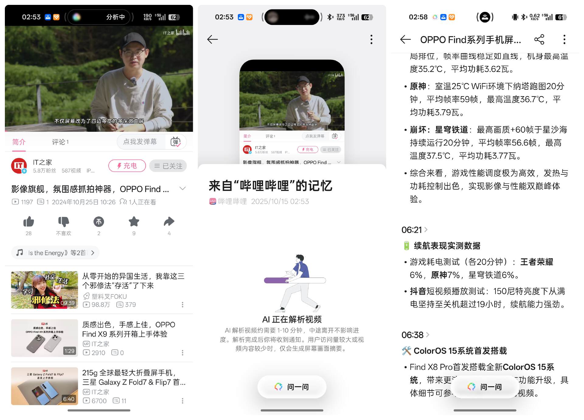 举个简单例子,看到B站上一个超长的干货或者是教程视频,但是自己又耐不下性子看下去,这时候打开“一键闪记”(按下 Find X9 系列的闪记键),小布便会自动解析视频的图像、音频和字幕,生成一份带有时间戳的 AI 章节摘要。