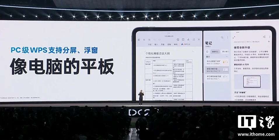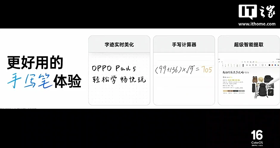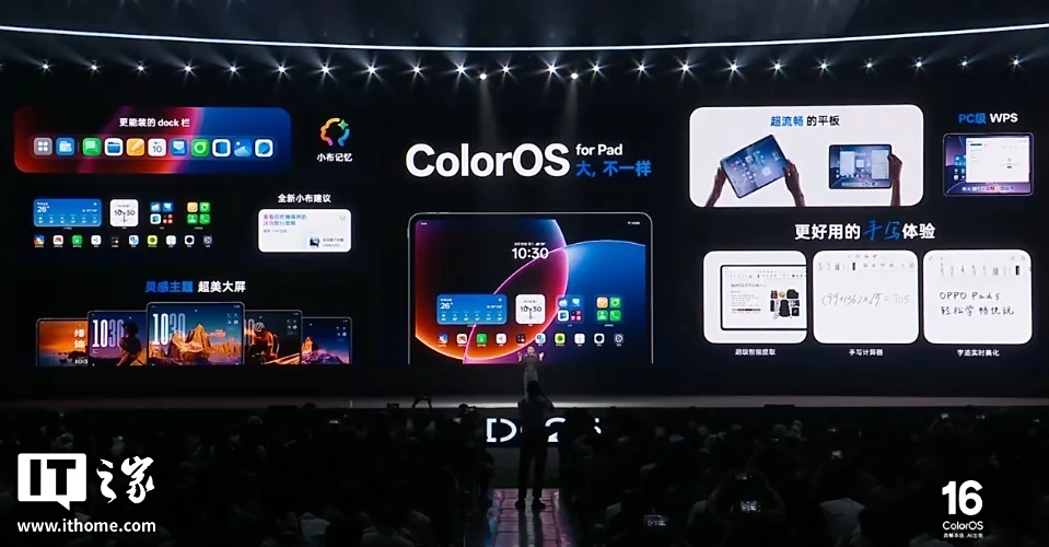 ColorOS 16 的平板设计也迎来大更新,优化大屏桌面布局宫格,更能装的 dock 栏,支持灵感主题;手写笔的体验也迎来加强,支持字迹实时美化、手写计算等;PC 级 WPS 支持分屏、浮窗。