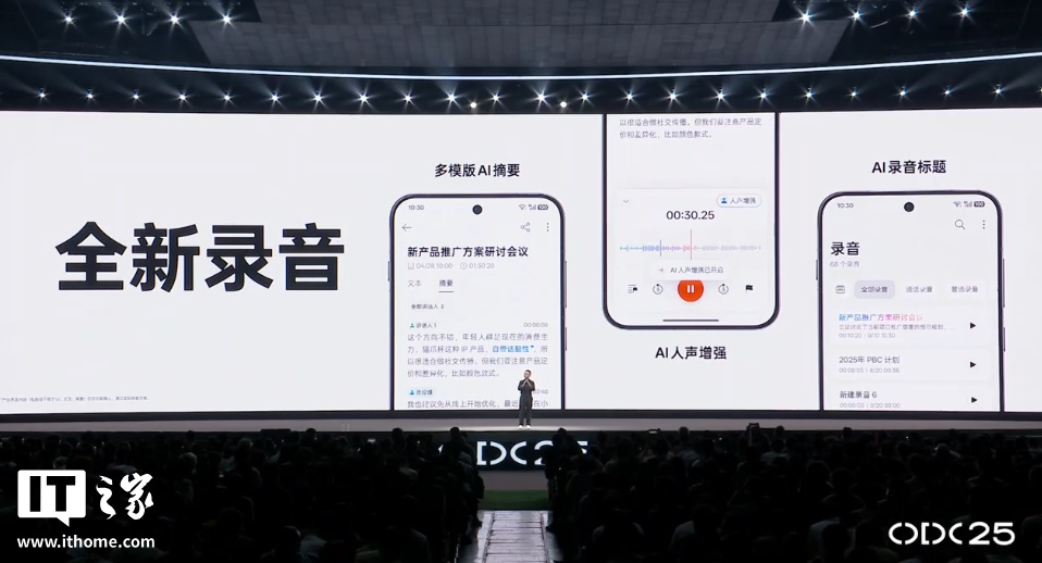 ColorOS 16 的录音功能也迎来 AI 升级,支持多模板 AI 摘要、AI 人声增强、AI 录音标题。