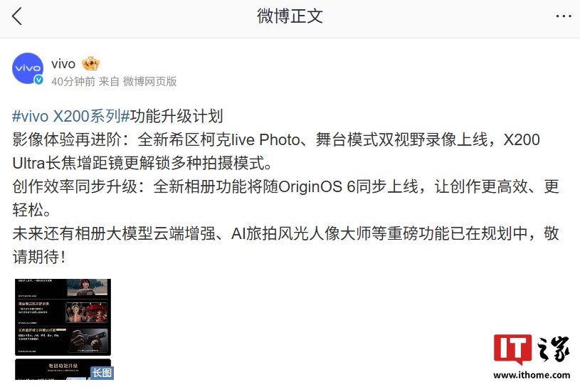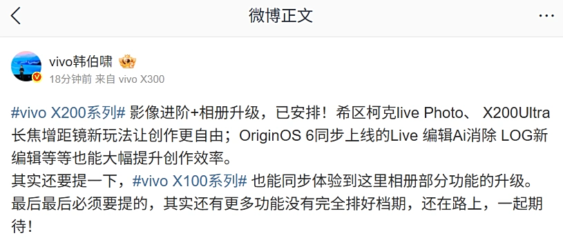 文章来源于互联网:vivo X200 系列手机功能升级计划公布,含全新希区柯克 live Photo、相册大模型云端增强等