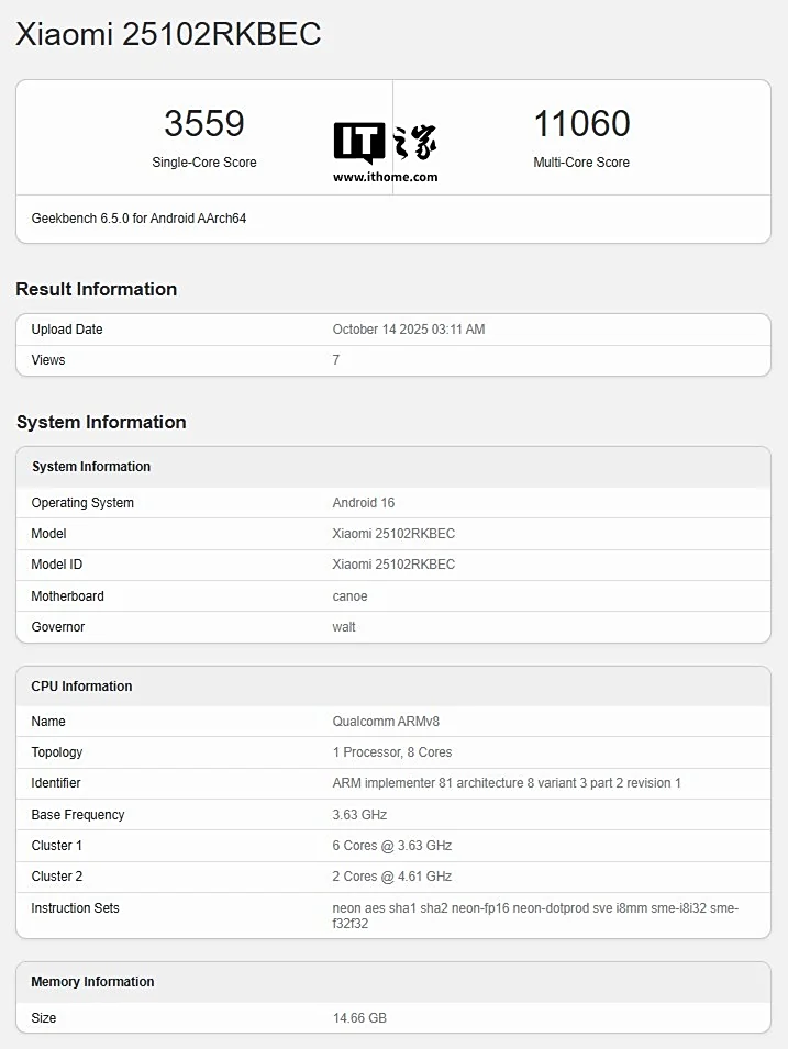 IT之家 10 月 15 日消息,科技媒体 Notebook Check 今天(10 月 15 日)发布博文,报道称小米 REDMI K90 Pro 手机现身 GeekBench 跑分库,6.5.0 版本单核成绩为 3559 分,多核成绩为 11060 分。
