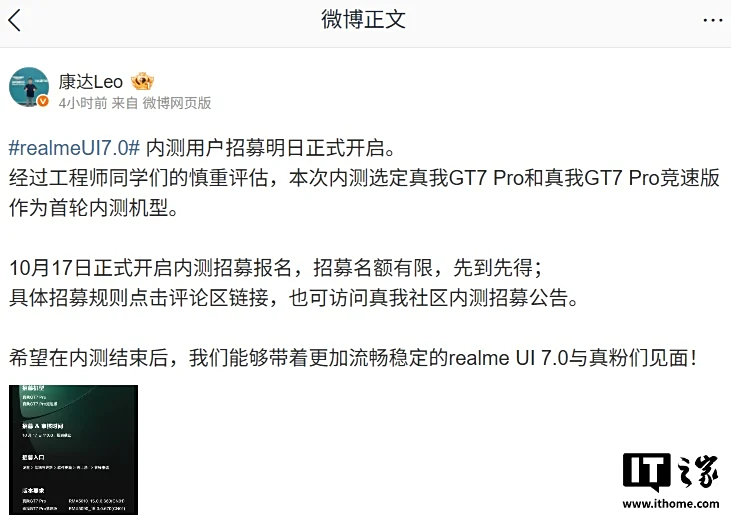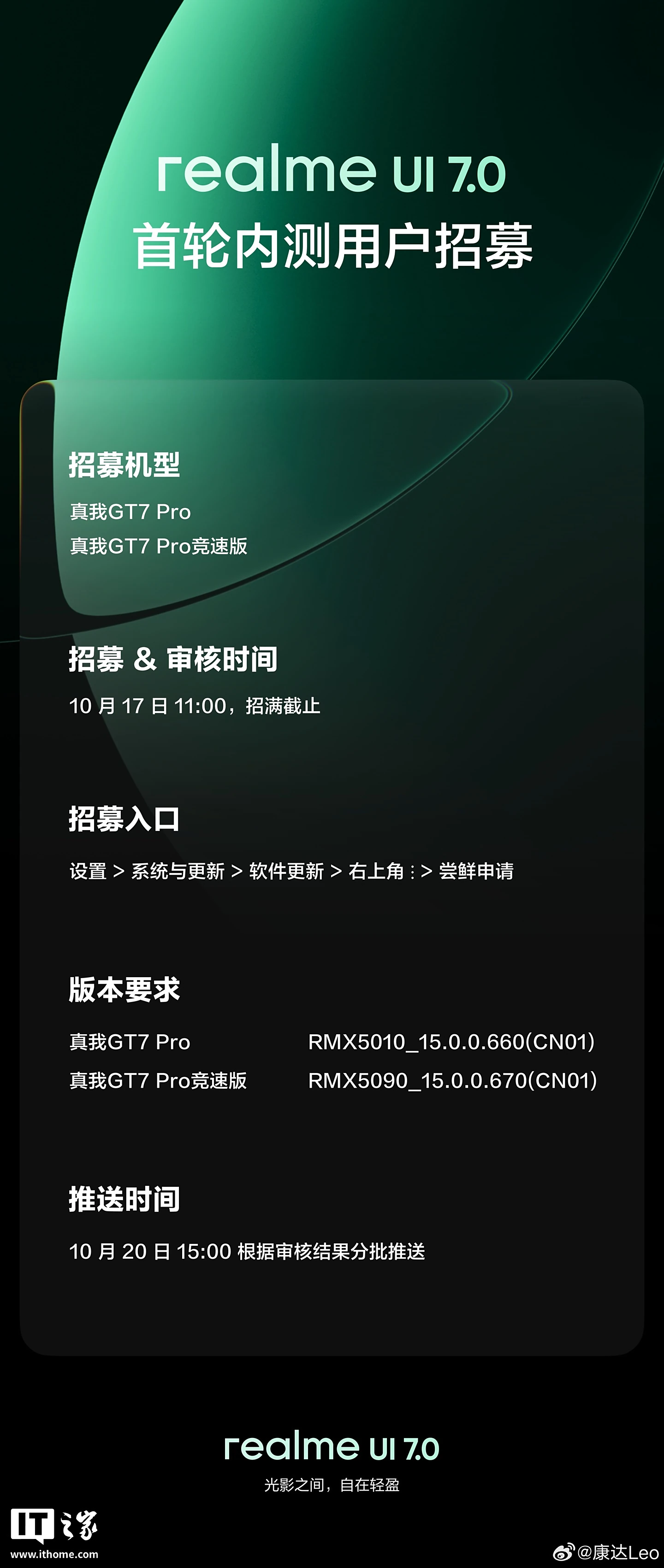 IT之家 10 月 16 日消息,realme UI 产品经理 @康达Leo 今日宣布,realme UI 7.0 内测用户招募明日正式开启。经过工程师的慎重评估,本次内测选定真我 GT7 Pro 和真我 GT7 Pro 竞速版作为首轮内测机型。