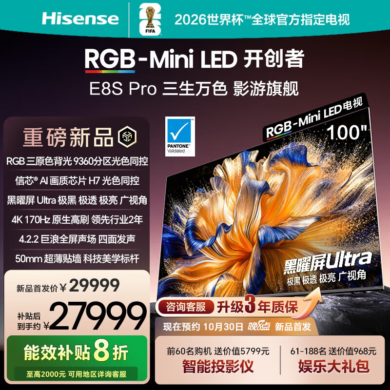 京东海信 RGB-MiniLED 电视 E8S Pro 100 吋 光色同控 9360 分区 H7 芯片 黑曜屏 Ultra 170Hz 高刷 100E8S Pro29099.03 元直达链接