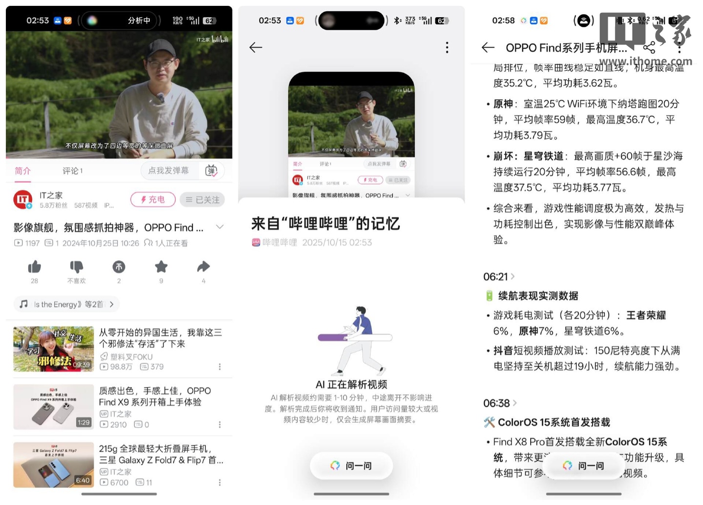 举个简单例子,看到B站上一个超长的干货或者是教程视频,但是自己又耐不下性子看下去,这时候打开“一键闪记”(按下 Find X9 系列的闪记键),小布便会自动解析视频的图像、音频和字幕,核心观点一目了然,点击就能跳转到视频相应的进度,效率直接拉满。