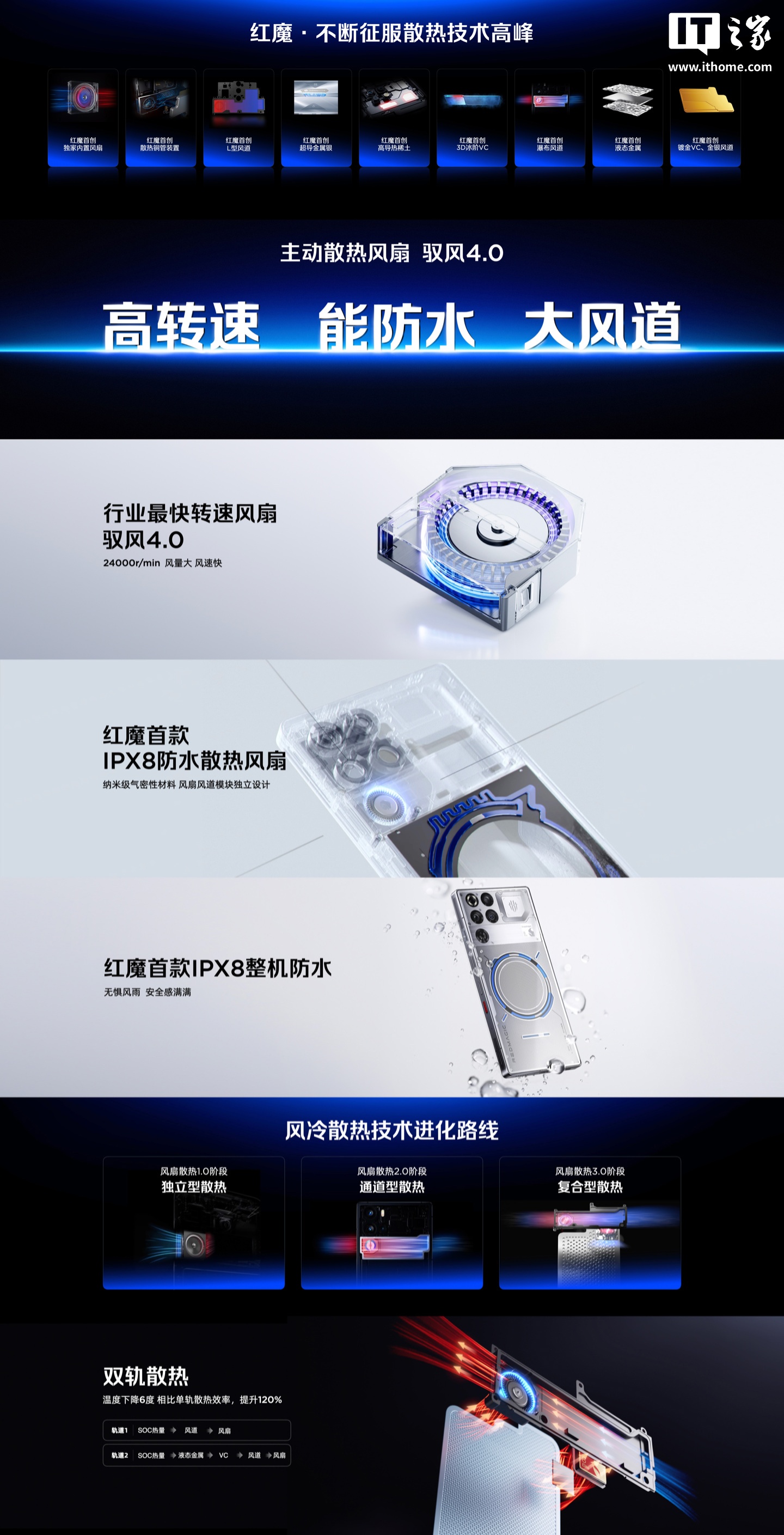 IT之家从红魔游戏手机官方获悉,红魔 11 Pro 系列手机搭载「主动散热风扇驭风 4.0」,拥有 24000r / min 行业最快转速风扇,并红魔首发 IPX8 防水散热风扇(纳米级气密性材料 + 风扇风道模块独立设计)、IPX8 整机防水。