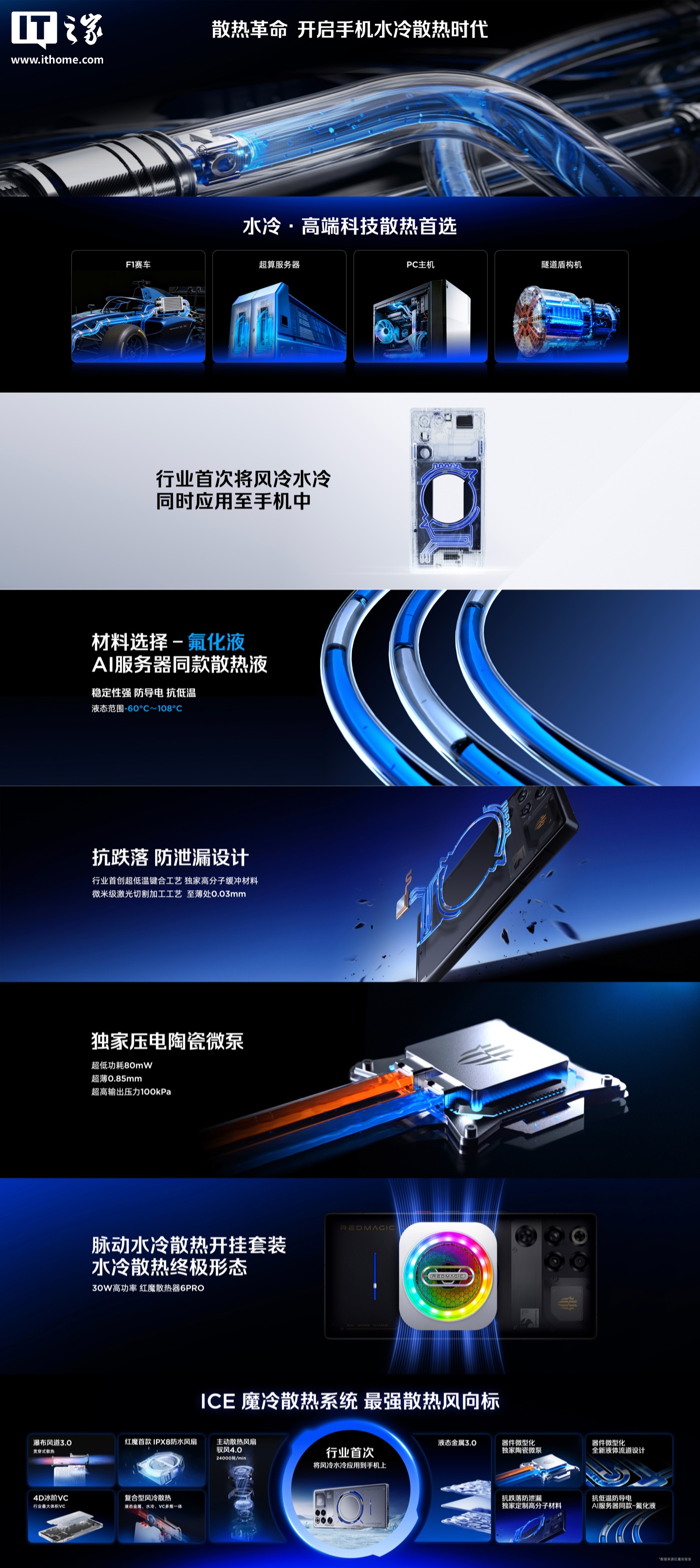 红魔 11 Pro 系列手机还搭载脉动水冷引擎,行业首次将风冷水冷同时应用至手机中,并选择 AI 服务器同款散热液「氟化液」,具备稳定性强、防导电、抗低温特性,液态范围 -60°C~108°C。