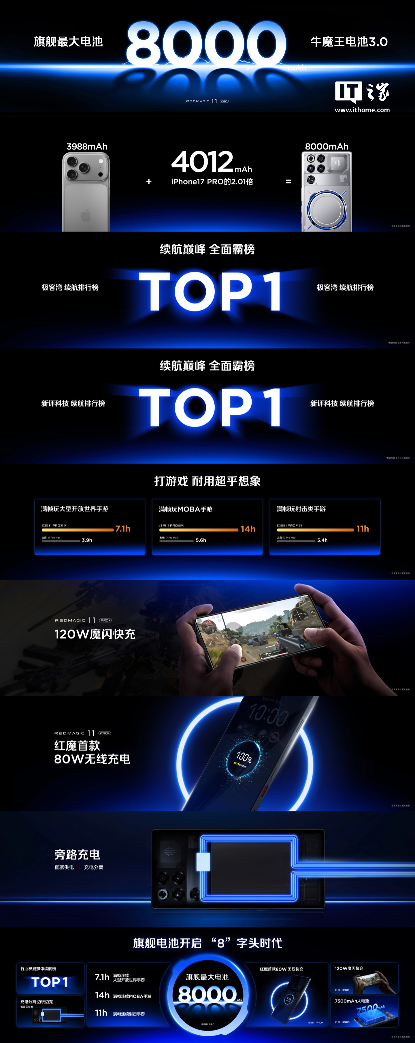 IT之家 10 月 17 日消息,红魔 11Pro 系列新品发布会正在进行中,红魔游戏手机产品总经理姜超宣布,红魔 11 Pro 系列手机开启旗舰手机“8”字头时代。新机搭载 8000mAh 牛魔王电池 3.0,是旗舰最大电池,续航测试 TOP1。
